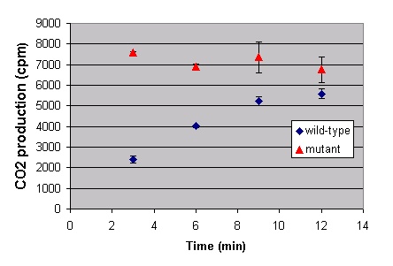 Since production of CO2 requires oxygen (O2), rapid CO2 production should be accompanied by rapid O2 consumption. Too bad we don’t have an O2 electrode…. I realized, however, that if I put the mutant strain in a closed vial (as I normally do anyway for my CO2 experiments), it should run out of O2 much faster than the normal (“wild-type”) strain and should thus stop producing CO2 much sooner. So I tested this hypothesis. Just as I predicted, the mutant produced lots of CO2 for a couple minutes and then stopped, whereas the wild type made CO2 at a much slower rate but for a much longer period of time! (Triumphant trumpet solo goes here.) In conclusion, the mutant is indeed capable of generating CO2 much more quickly than the wild type. Exactly how it does this will be a topic of future research.
