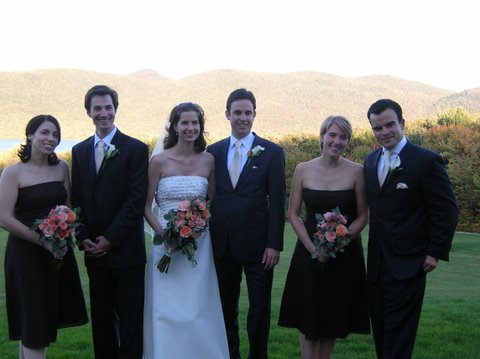 A number of toasts were offered. My father recited a “talking blues” that incorporated many favorite family sayings, including “This too shall pass” (from his mother), “When it comes to parenting, a bit of brutality is justified now and then” (from his father), “The opposite may be equally true” (from a former boyfriend of his sister), and “Be truthful, but don’t overdo it” (premarital advice from him to me). The groom’s three siblings delivered an amusing expose of their brother’s supposed life as a secret agent (code-named “Goldfingers” in reference to his keyboard skills). They pointed out that his current job with Merrill Lynch is hardly a convincing cover for his covert activities: “Why should we believe that a pianist has been put in charge of millions of dollars’ worth of obscure South American financial commodities?”