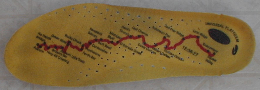 I have no strong feelings for or against the colors and design of the exterior of the shoe, but the inside is really cool. It shows the elevation profile of the Western States 100, listing the checkpoints all the way from Squaw Valley to Auburn. Also prominently displayed is Scott Jurek‘s course record of 15:36:27.