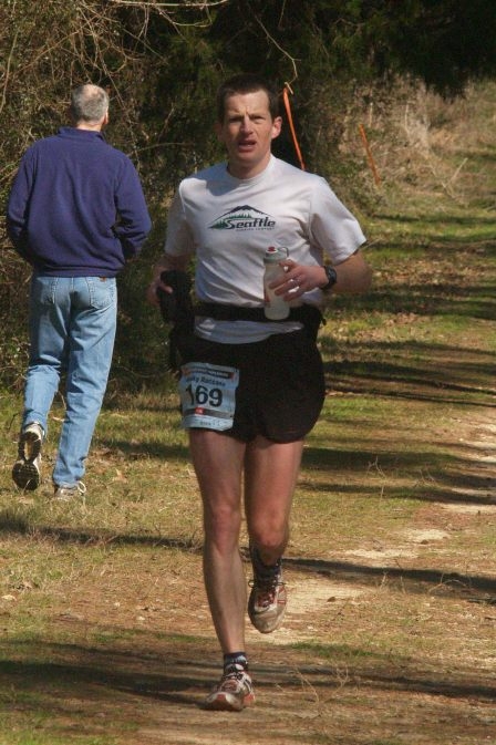 I spent much of the first lap running and chatting with Paul Hopwood, who had finished the grueling HURT 100 only three weeks earlier. He was in good spirits and seemed light on his feet until I happened to ask him about the number of 100-milers he had completed. At that instant his toes caught a root and he went down, rolling forward and springing back up again. “Well, this is going to be my last one,” he said. “Thanks for asking, Greg.”
