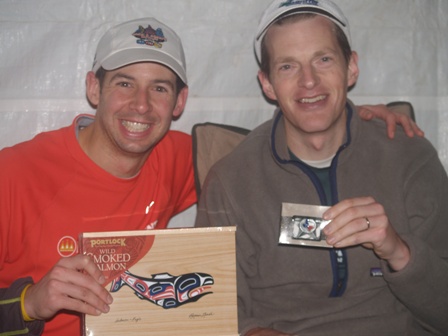 Pacer Paul Terranova (holding the box of smoked salmon that I gave him as a thank-you gift) and me (holding the belt buckle awarded to sub-24-hour finishers) in the recovery tent after the race.