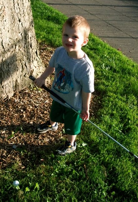 By coincidence, Phil (now three and a half) also carded a 48 today. That was the number of strokes he needed to advance from the makeshift tee area to the designated goal, a giant tree about 30 yards away.