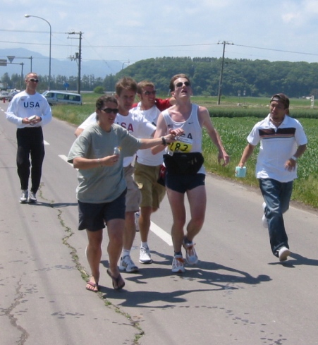 Japan 2005: Me at 80K, assisted by Colin, Liz (handing out Gu), and Lion, Mike, and Tak (with sponges).