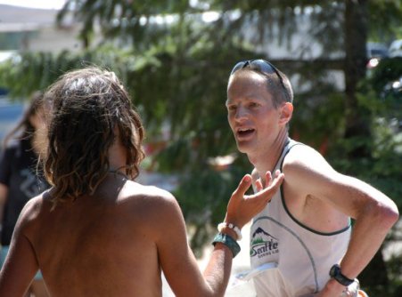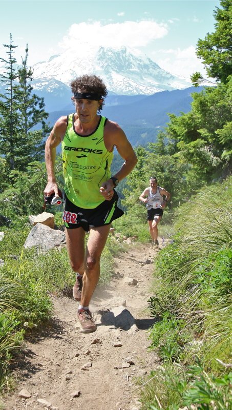 With this unencouraging feedback from the various creek checkpoints, it was time to fish or cut bait. I stepped up the intensity, passed Adam Lint and Josh Brimhall, and got to Fawn Ridge in 4:29. I had again leapfrogged slightly ahead of my 2009 self (4:30). The ascent continued and so did my march forward place-wise. I passed Tim Olson, whom I briefly mistook for Tony because he’s long-haired and was running shirtless and in dark shorts, and then caught up to Scott Jurek, who was unmistakable in his fluorescent green top. “I love that singlet, Jurek,” I called out to him. “It’s like a giant bull’s-eye.”