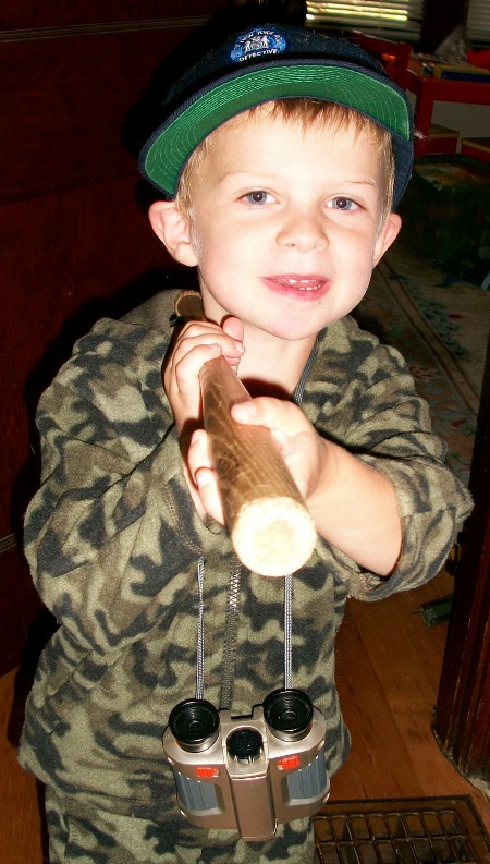 With his army outfit, NYPD Blue cap, binoculars, and baseball bat doubling as a gun, doesn’t he look ready to keep the inmates subdued? The funny thing, though, is that once he puts me in jail, he immediately lies down and starts making loud snoring noises. This is my cue to escape so that the cycle can begin again. On a good day (or a bad one, depending on your perspective), I might bust out 15 or 20 times.