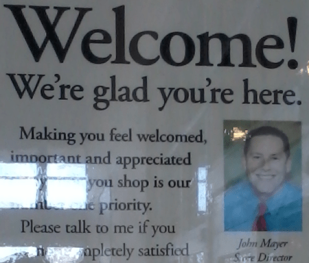 I like the Ballard Fred Meyer for many reasons. You can buy eggs, jeans for your 5-year-old, and mirrors all in one place; the supervised holding pen for kids is nice too. What I like most, though, is the greeting message from John Mayer.