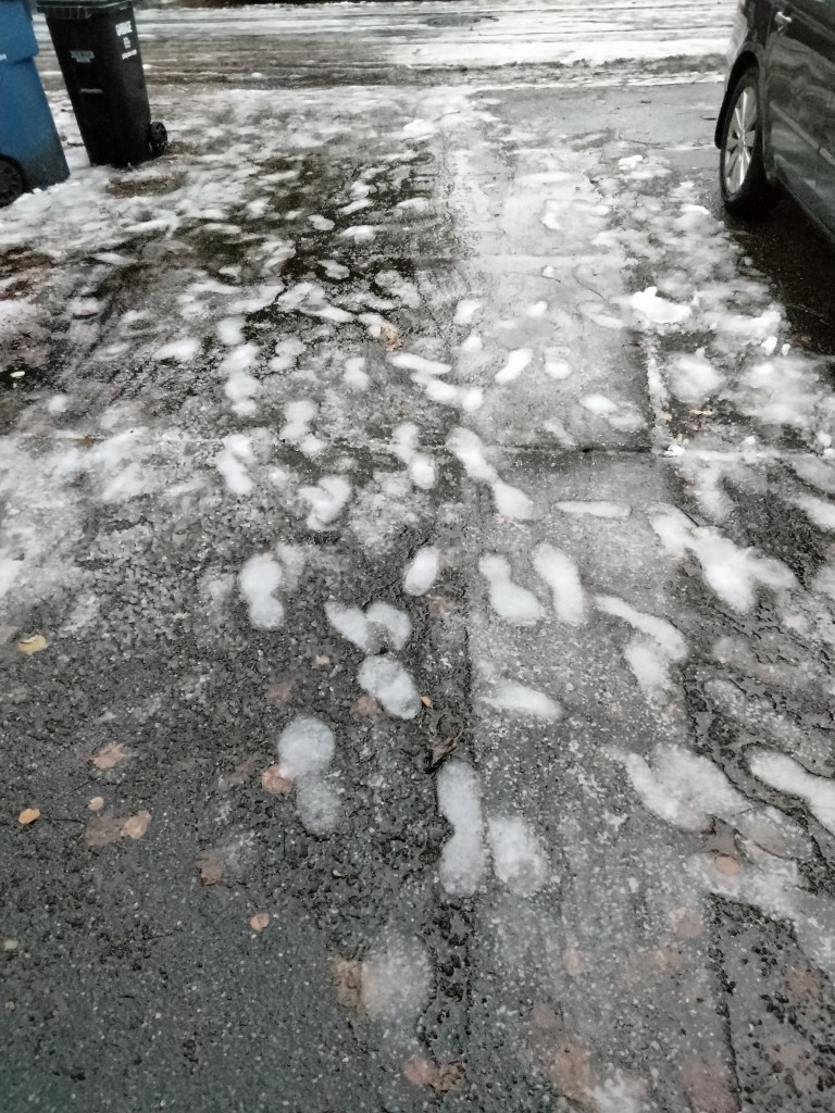 Here’s a hint: we had snow and unseasonably cold weather for a few days (with occasional trips across the driveway on foot), and then the snow was melted and washed away by warmer rains. The photo above was taken most of the way through the washing-away process.
