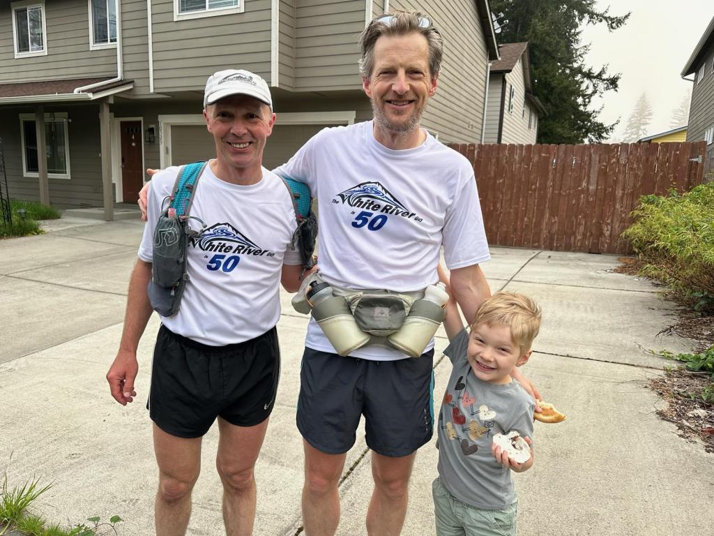 As the pieces fell into place, I asked my one semi-regular running companion, Uli, if he’d be willing to join me. Like me, Uli is well past his prime as a competitive athlete; he turned 50 last year. (My present to him was a WHITE RIVER 50 shirt modified to say “the WHITE RIVER guy is 50,” as seen in the pictures below. The back of the shirt lists a bunch of fake sponsors such as Cologuard, Geritol, Viagra, and Old Balance.) Nevertheless he is still fit enough to easily handle any birthday challenge I could dream up. He said yes.