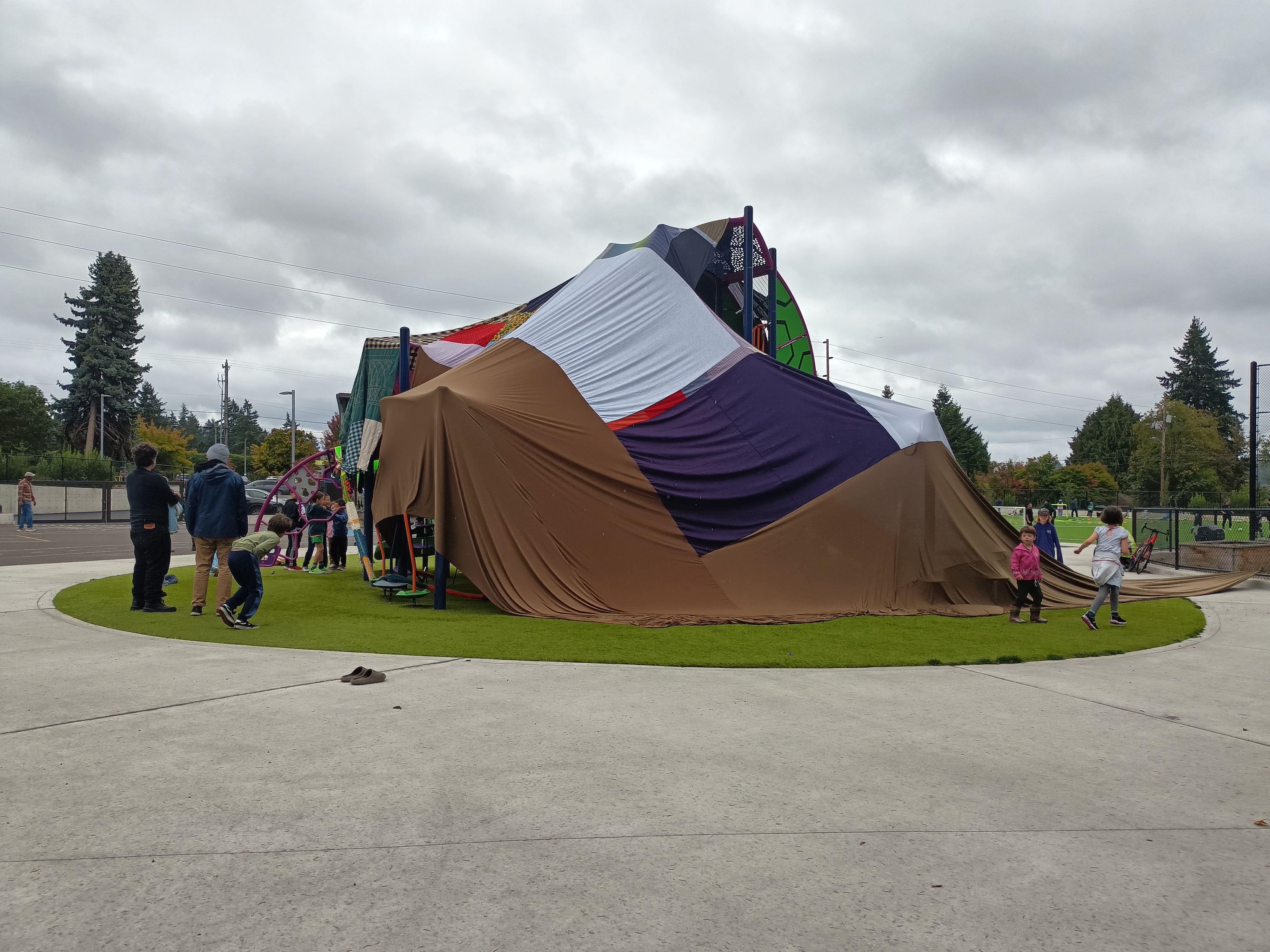 A couple of weekends ago, the art teacher at Ben’s elementary school did something that seemed audacious yet mild, something logistically complex yet conceptually simple. He draped an enormous hand-sewn quilt over a multi-story play structure, transforming a fun object into a totally different fun object: an “art fort.”